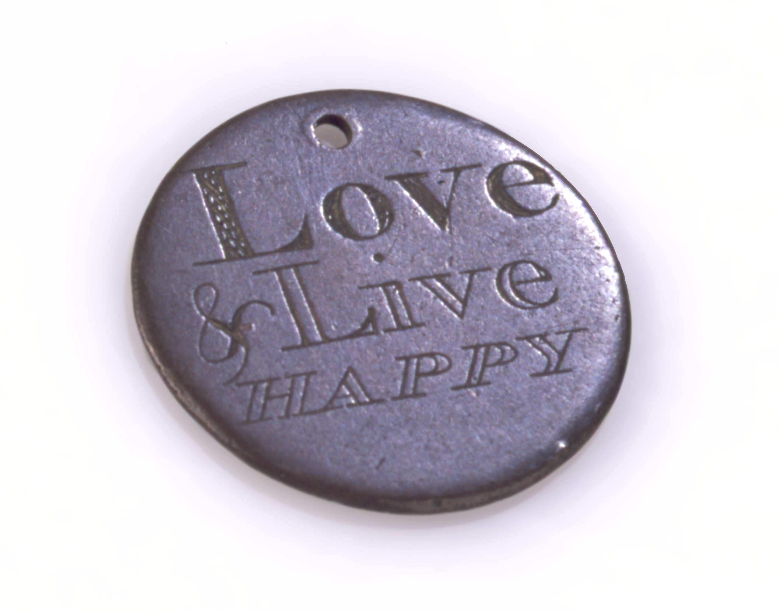 Love token made circa 1800 in Great Britain, with the inscriptions 'TS' and 'LOVE & LIVE HAPPY. Holed for wearing.