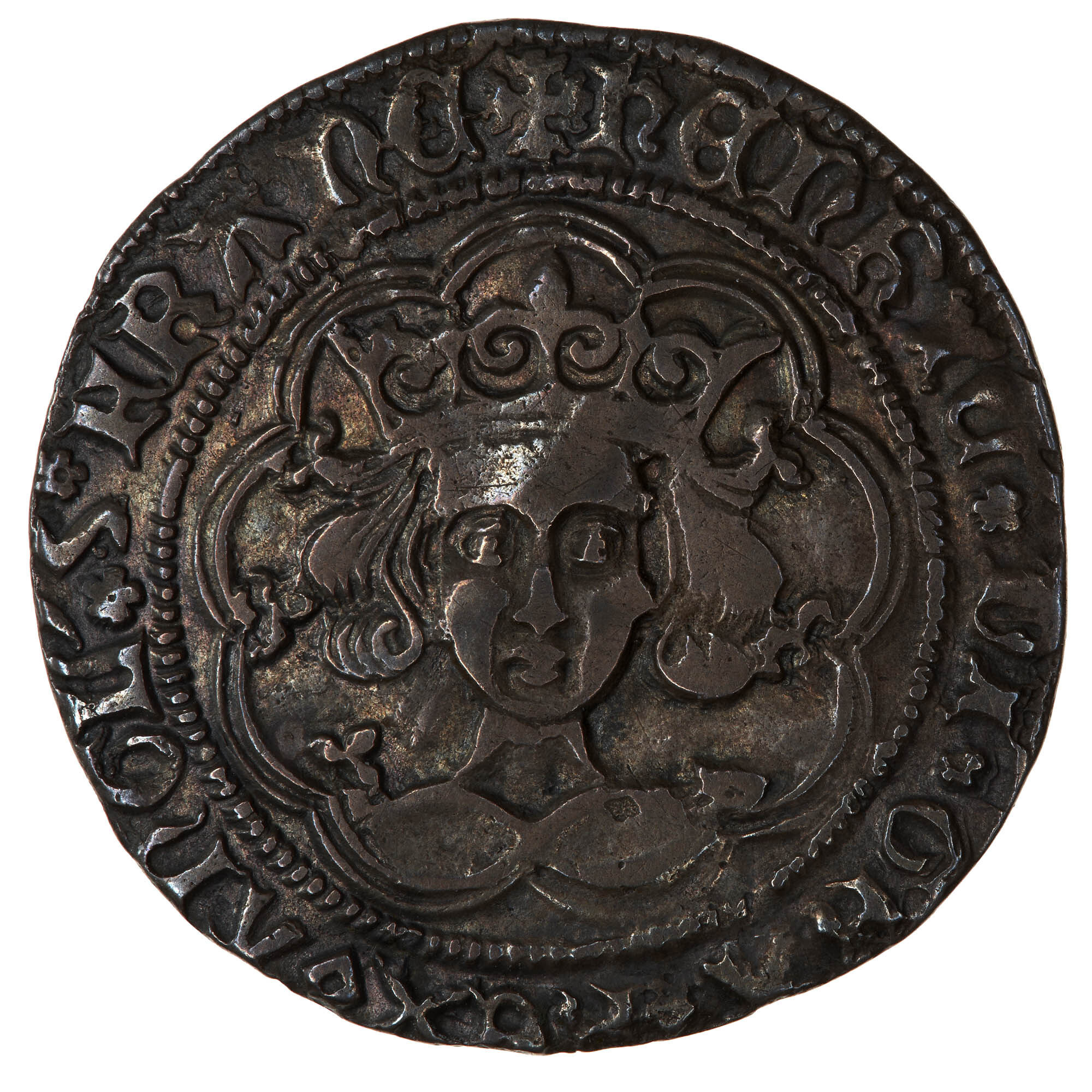 A crowned bust of the King facing within a tressure of nine arches; around, (mm cross IIIa) HENRIC DI GRA REX ANGL Z FRANC