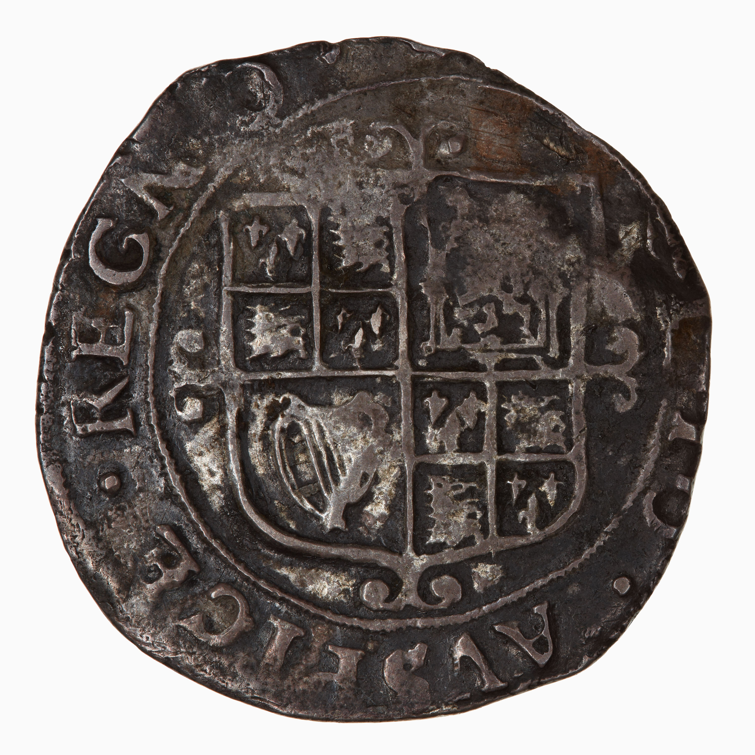 Flat topped shield quartered with combined arms of England and France (1st and 4th), Scotland and Ireland over a cross moline; around, CHRISTO AVSPICE REGNO (mm. off flan) (translation: I reign under the auspices of Christ)