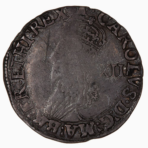 Crowned bust of the King facing left wearing a lace collar and armour; behind, the denomination in pence in Roman numerals, XII; around, CAROLVS D G MA BR FR ET HI REX (mm. bell, worn)