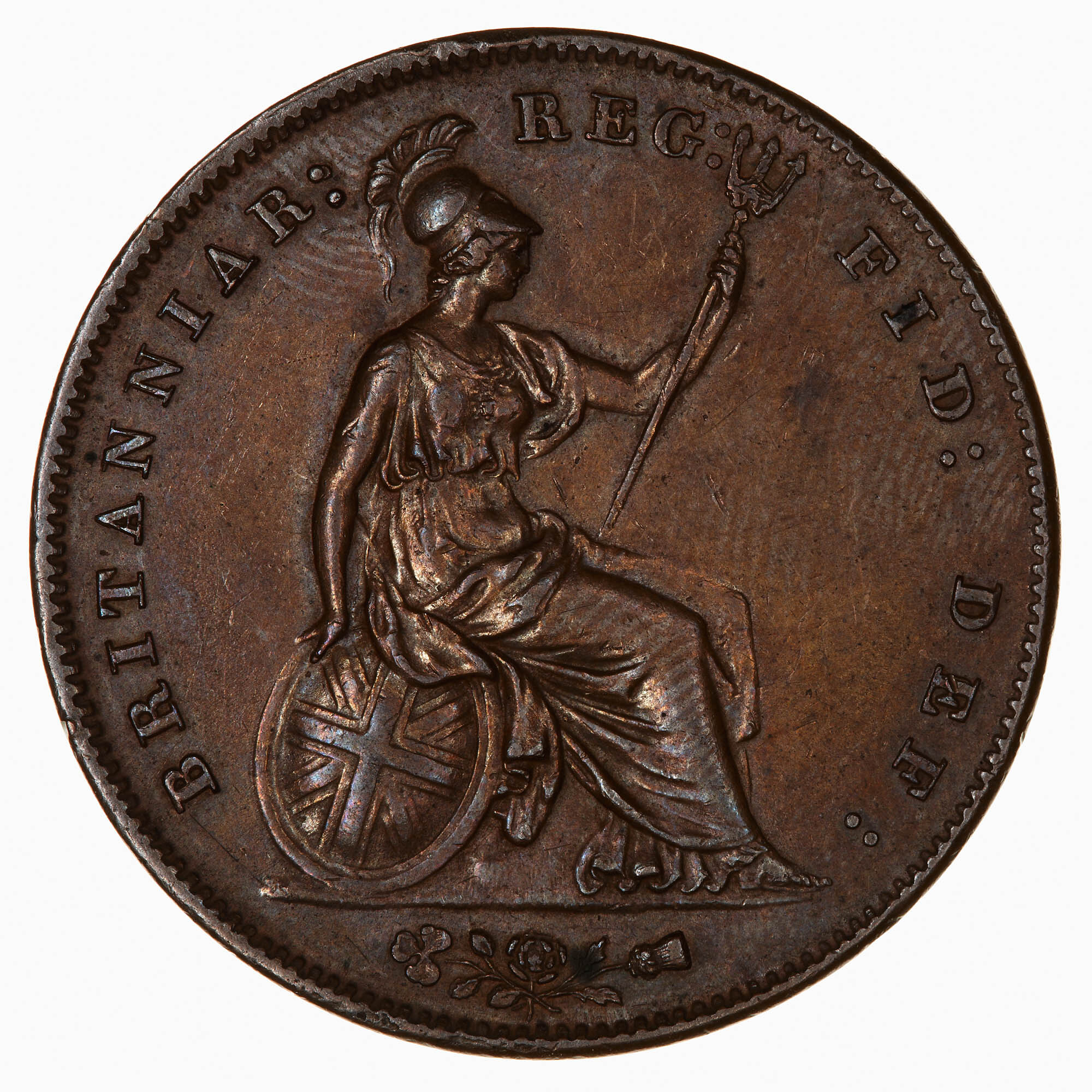 Britannia seated facing right holding trident and resting her right hand on a shield; around, BRITANNIAR: REG: FID: DEF:; in exergue, a rose, thistle and shamrock united.