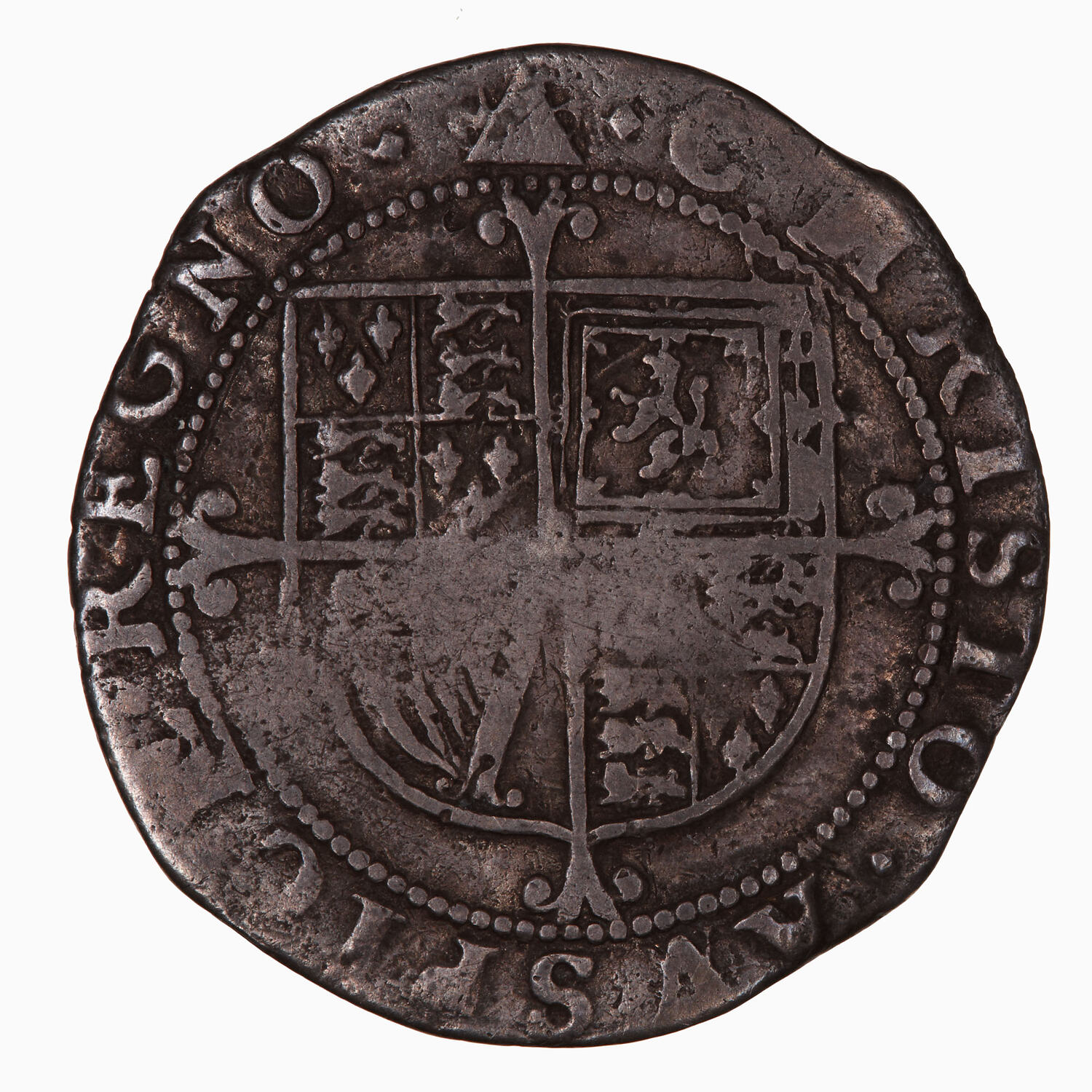 Flat topped shield quartered with combined arms of England and France (1st and 4th), Scotland and Ireland over a cross moline; around, CHRISTO AVSPICE REGNO (mm. triangle) (translation: I reign under the auspices of Christ)