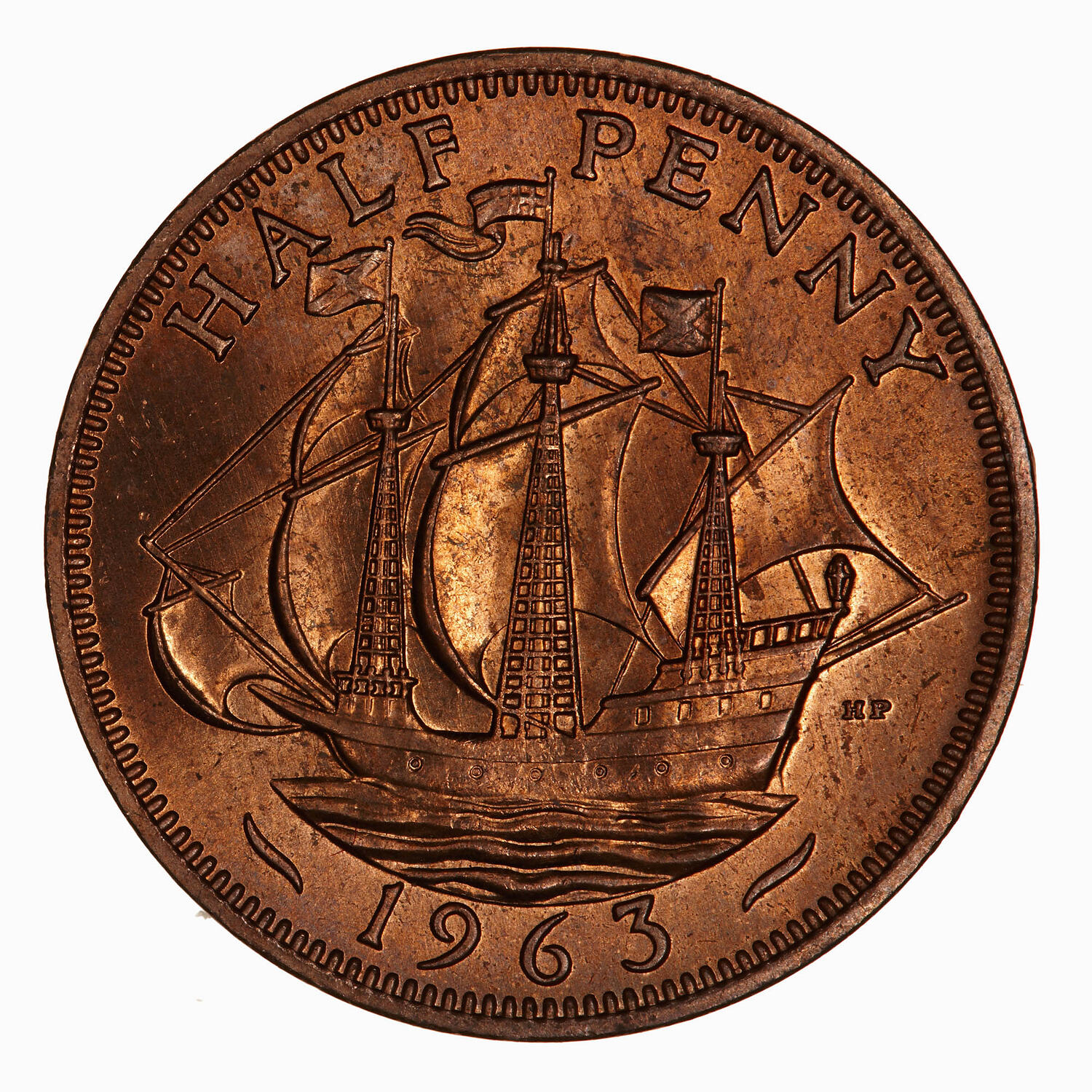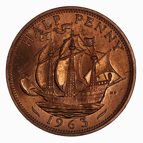 Three-masted sailing ship (the Golden Hind) to left; behind in small letters HP (T. Humphrey Paget); around above, HALF PENNY; below, 1963