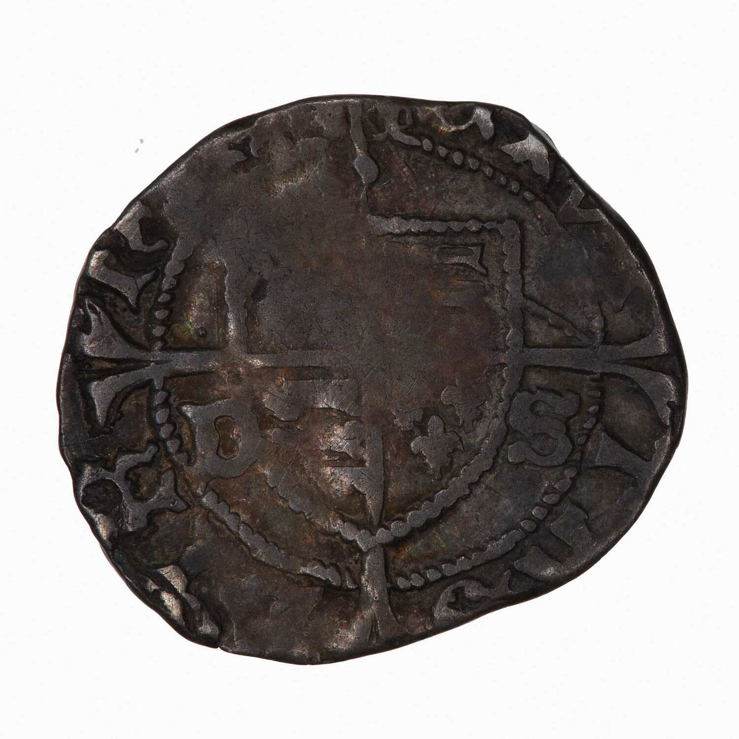 A shield quartered with the arms of England and France and dividing the letters DS, the shield is over a long cross which divides the legend, CIVITAS DVRHAM