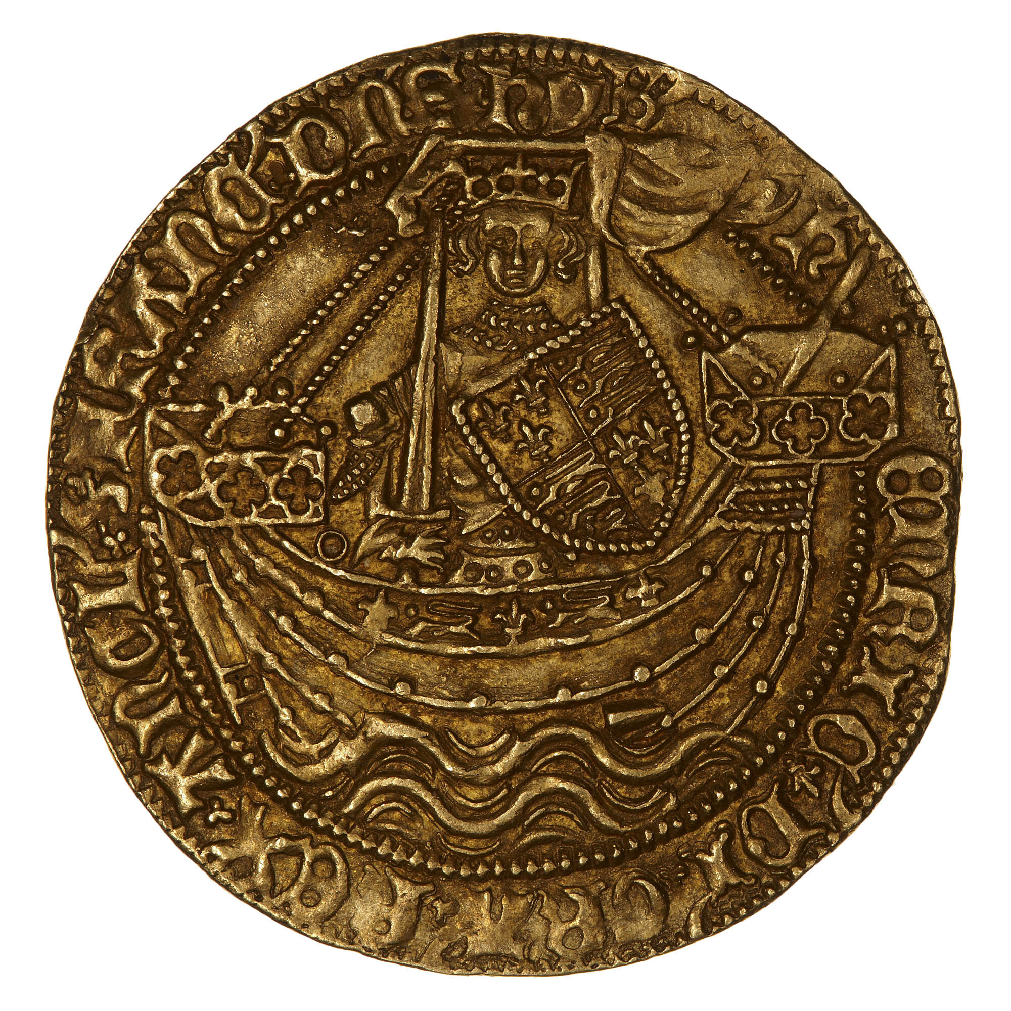 The King, crowned, wearing armour and holding a sword (annulet in field to left of sword) and a shield quartered with the arms of England and France, standing, facing on a ship at sea; around, HENRIC DI GRA REX ANGL Z FRANC DNS HIB.