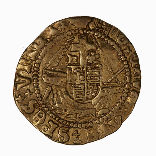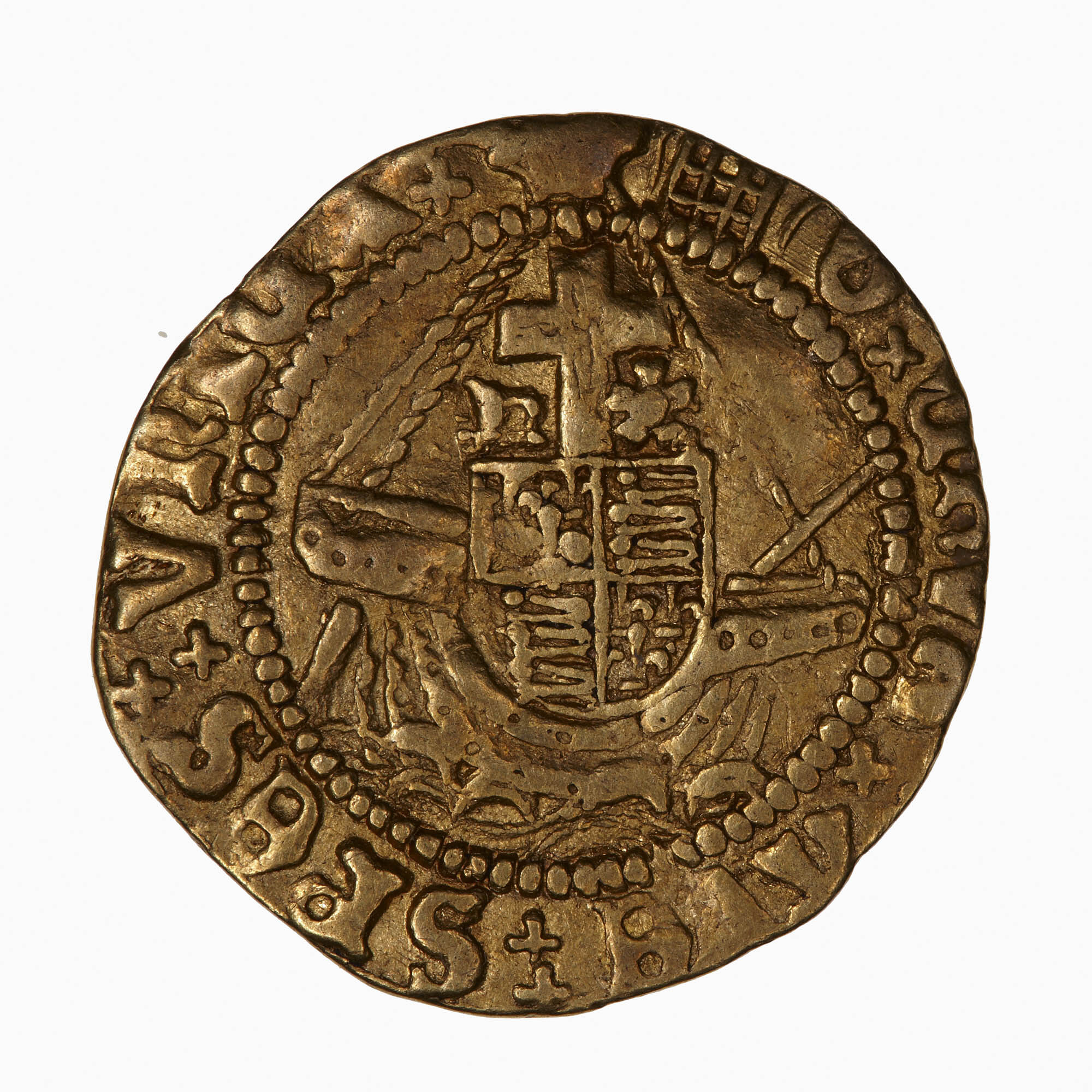 A ship with a crucifix as a mast from which hangs a shield quartered with the arms of England and France, the cross divides an H and a rose; around, (mm portcullis crowned) O CRVX AVE SPES VNICA (translation: Hail O Cross, our only hope)