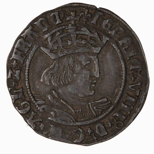 A crowned bust of the King facing right within a circle of beads; around, + (mm lis) HENRIC VIII D G R AGL Z FRANC