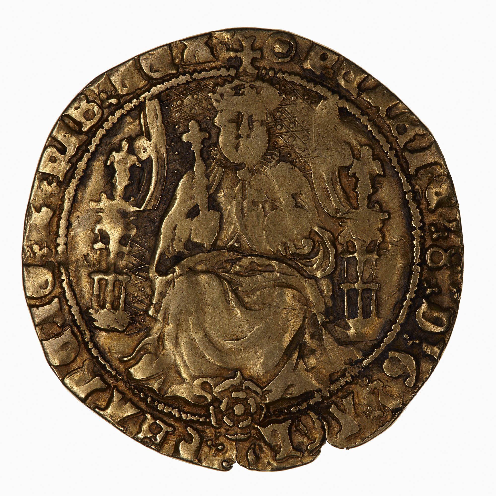 The King enthroned holding a sceptre and globe, rose at his feet; around, (mm pellet in annulet) HENRIC 8 D G AGL FRANCIE Z HIB REX