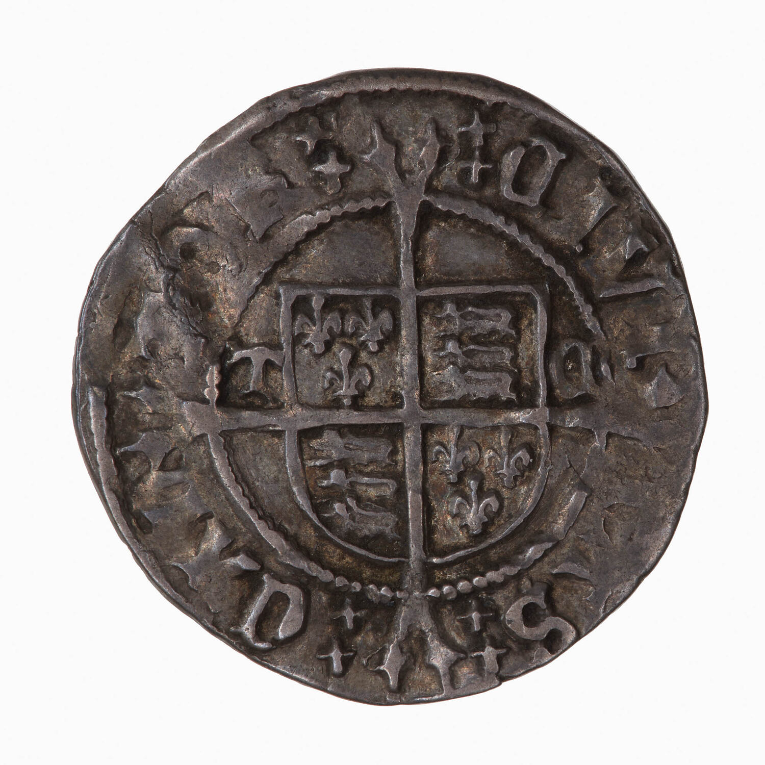 The reverse has a shield quartered with the arms of England and France, dividing the letters TC, below a long cross fourchee; around, (mm. none) CIVITAS CANTOR