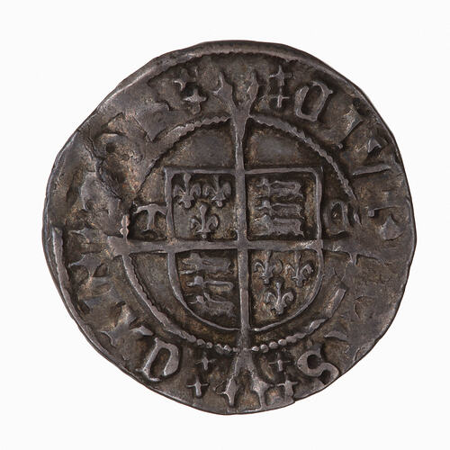 A crowned bust of the King facing right within a circle of beads; around, + (mm Catherine Wheel) HENRIC VIII D G R AGL Z F