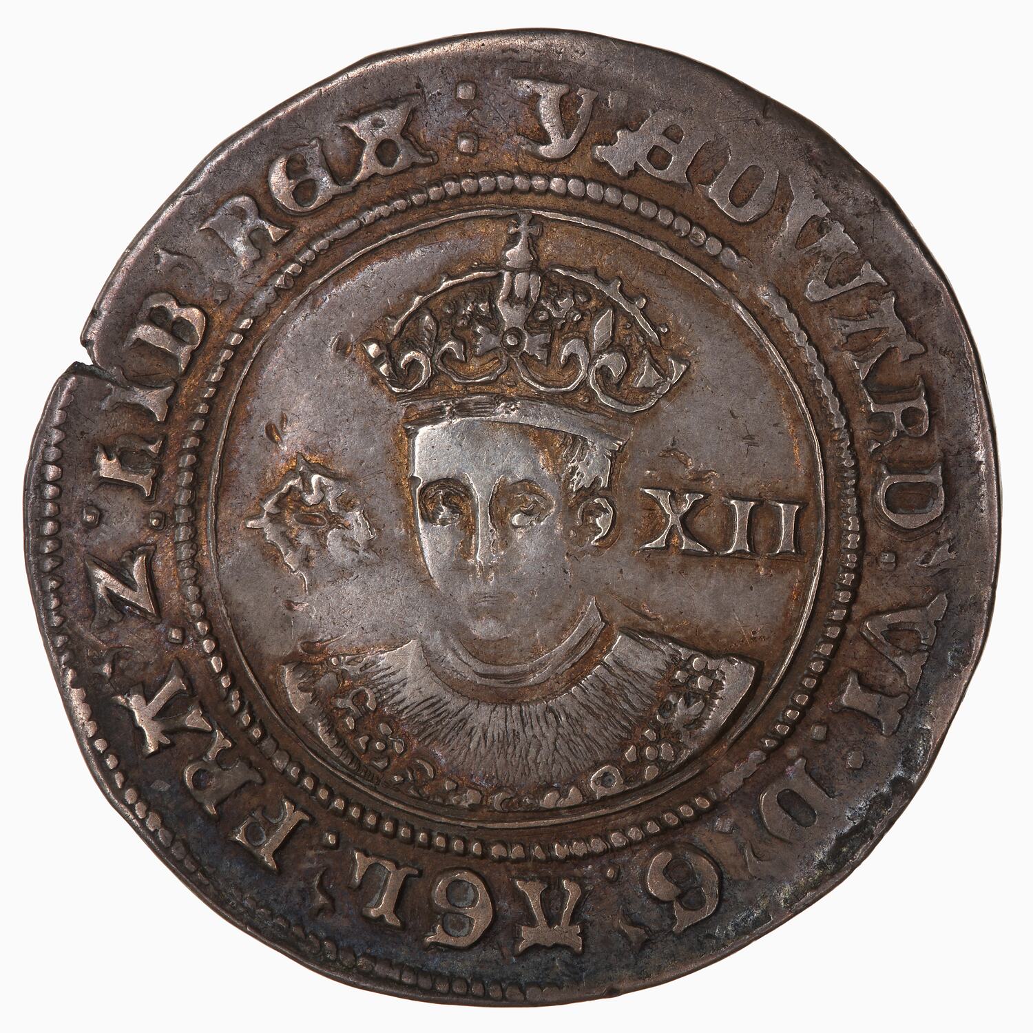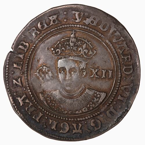 Crowned bust of the King facing with rose at left and denomination in pence, XII, at right; around, (mm. Y) EDVVARD VI D G AGL FRA Z hIB REX (translation: Edward VI by the Grace of God King of England, France and Ireland)