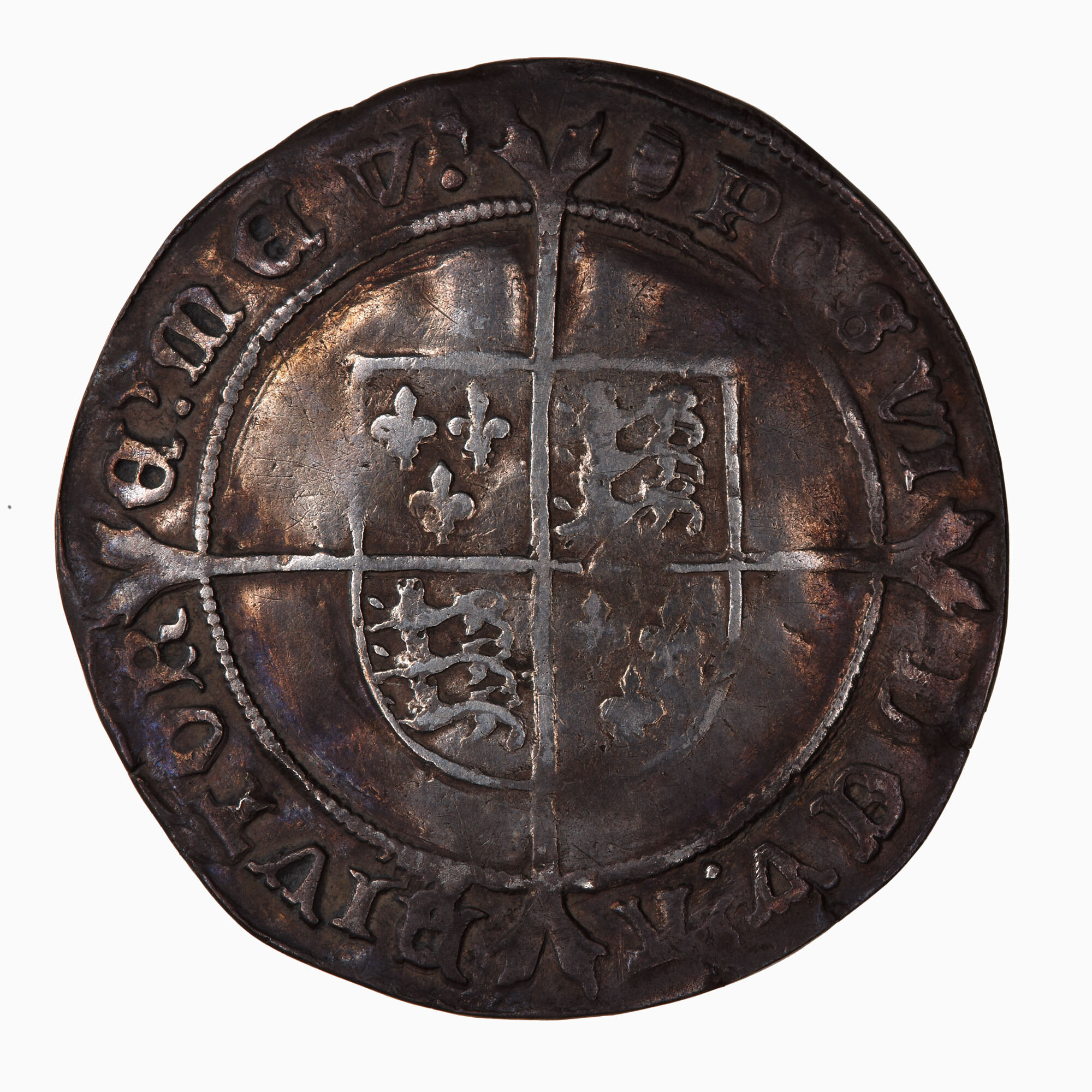 Crowned bust of the King facing with rose at left and denomination in pence, XII, at right; around, (mm. tun) EDVVARD VI D G AGL FRA Z hIB REX (translation: Edward VI by the Grace of God King of England, France and Ireland)