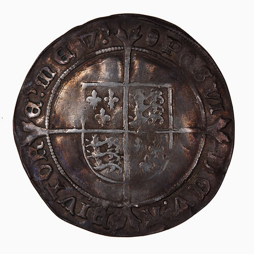 Royal shield, quartered with the arms of England and France, on a cross fourchee; around, (mm. tun) POSVI DEV ADIVITORE MEV (translation: I have made God my helper)
