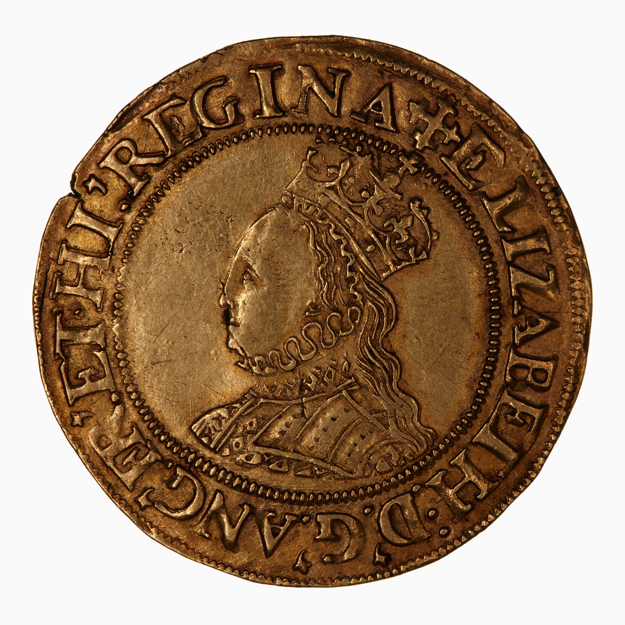 Within an inner bead circle, crowned bust of the Queen, wearing ruff and decorated dress, facing left; around, (mm. cross crosslet) ELIZABETH D G ANG FR ET HI REGINA