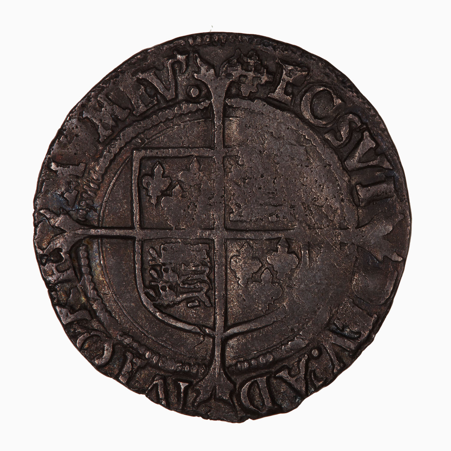 Within a bead circle a plain square top shield quartered with the arms of France (1 & 4) and England (2 & 3), over a long cross fourchee; around, (mm. cross crosslet) POSVI DEV ADIVTOREM MEV (translation, I have made God my helper)