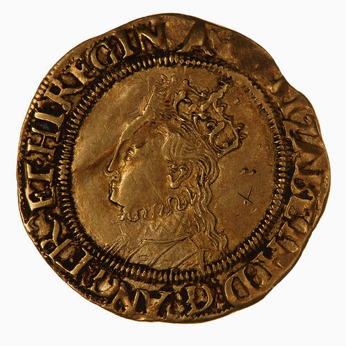 Within an inner bead circle, crowned bust of the Queen, wearing ruff and decorated dress, facing left; around, (mm. coronet) ELIZABETH D G AN FR ET HI REGINA