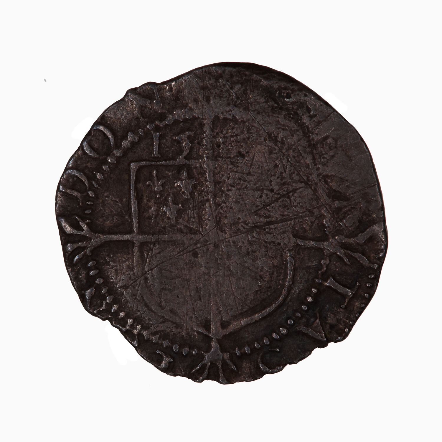 At centre within a beaded circle, cross fourchee quartered with the arms of France (1 & 4) and England (2 & 3); above, 15 .. (second part of date damaged); around, (mm pheon) CIVITAS LONDON