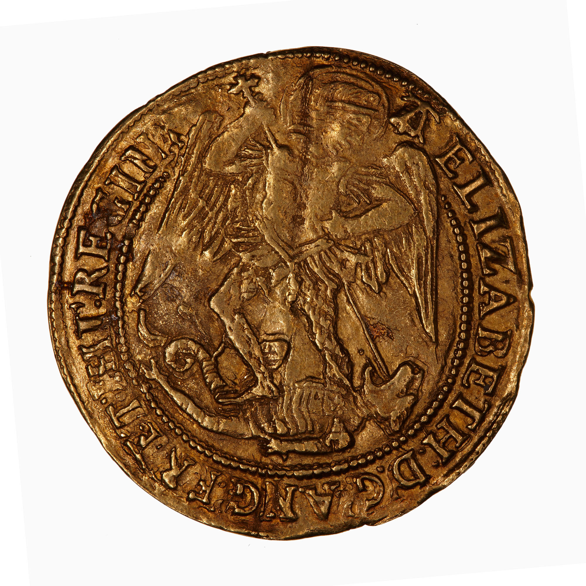 At centre, the Archangel St. Michael piercing a dragon in the mouth, his right foot on the dragon, wings spread; around, (mm. A) ELIZABETH D G ANG FR ET HI REGINA