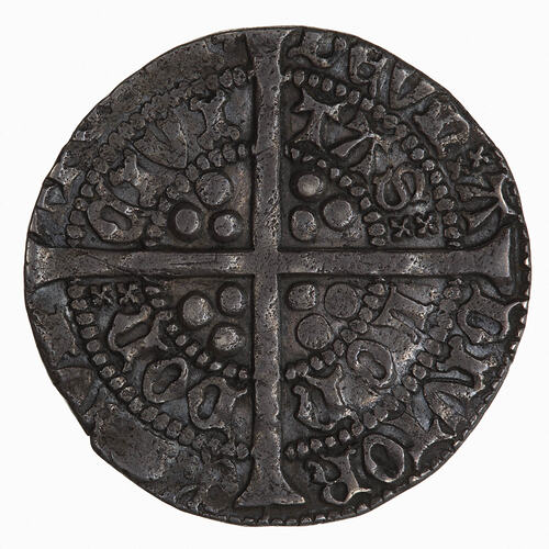 A long cross pattee dividing the legend; in each angle three pellets; around in two concentric circles, + POSVI DEVM ADIVTORE MEVM - CIVITAS LONDON (translation: I have made God my helper - City of London)