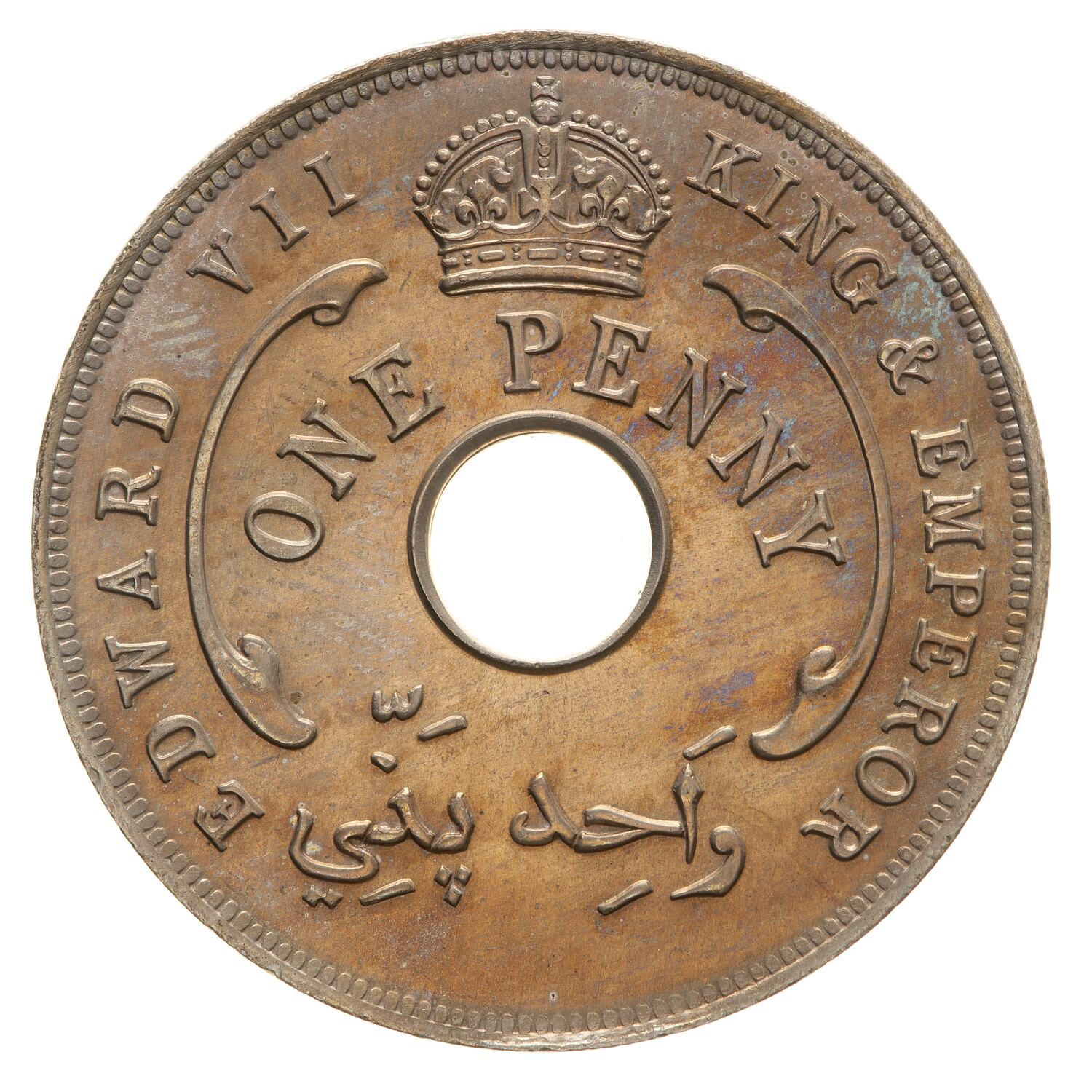 An imperial crown above a central circular hole with a scroll ornament to right and left; below crown, ONE PENNY; around, outside the scroll ornaments, EDWARD VII KING & EMPEROR; below hole in Arabic, the denomination