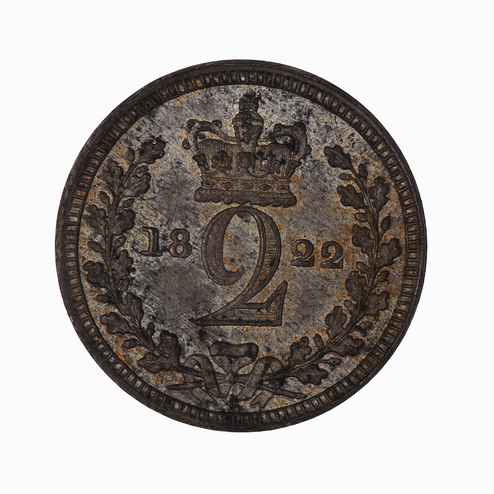 Within an open oak wreath, the numeral 2, crowned and dividing the date 1822
