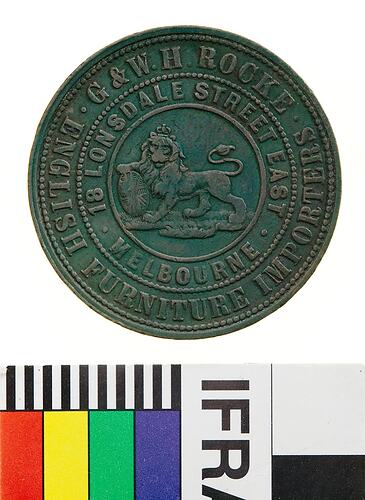 Obverse: G & W.H. ROCKE ENGLISH FURNITURE IMPORTERS 18 LONSDALE STREET EAST MELBOURNE Reverse: MELBOURNE VICTORIA 1859