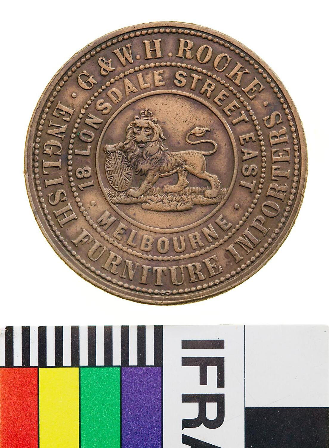 Obverse: G & W.H. ROCKE ENGLISH FURNITURE IMPORTERS 18 LONSDALE STREET EAST MELBOURNE Reverse: MELBOURNE VICTORIA 1859