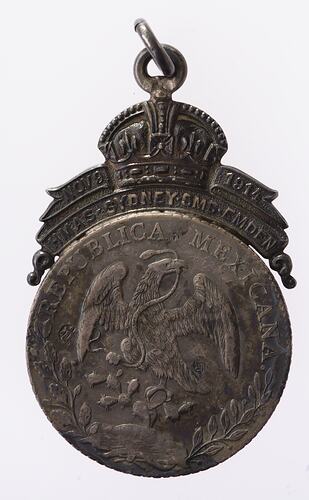 Mexican Eight reales from the wreck mounted under looped crown on NOV 9 1914 / HMAS . SYDNEY . SMS . EMDEN