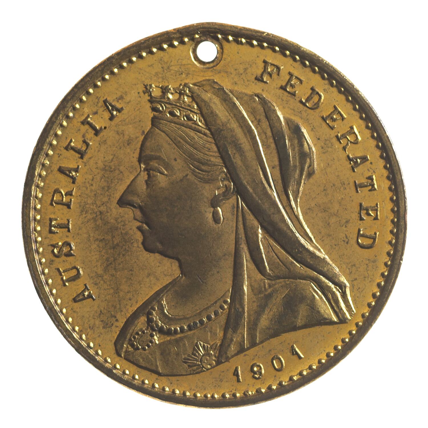 PLain (edge) Veiled bust of Queen Victoria left, around, AUSTRALIA FEDERATED; below 1901 (obverse) 3/4 facing bust of Lord Hopetoun; around, LORD HOPETOUN GOVERNOR- GENERAL 1901 Wearing suit with high collar and tie(reverse)
