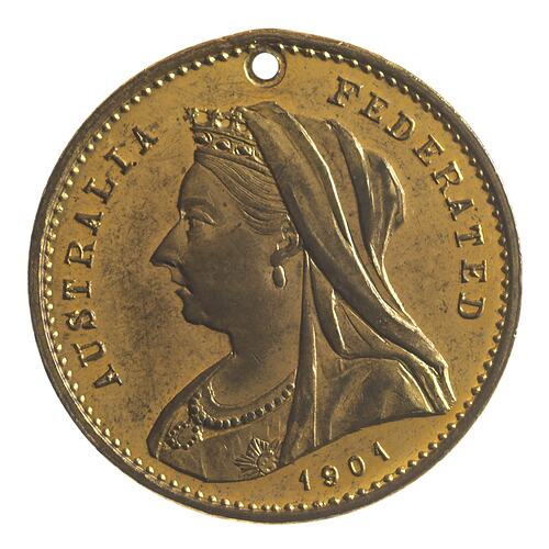 This medalet was obviously produced before the death of Queen Victoria in January 1901. It is one of many medals and medalets produced as souvenirs of the Federation of the Australian colonies, that was proclaimed on 1 January 1901.