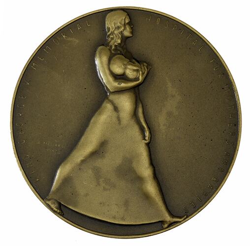 In 1943 Hungarian immigrant artist Andor Meszaros was commissioned to produce a large-scale sculpture entitled 'Maternity' for Sydney's King George V Hospital. Meszaros described the statue as 'a forward-striding, fully developed female figure, holding proudly in one arm the only real creation, the child.' Andor's wife Elizabeth was the model for the statue, and it was the most successful of his public sculptures. He was commissioned by the hospital to reinterpret the statue for this medal; available in either bronze or silver, it was sold through the hospital, with room on the reverse for a child's name to be engraved.