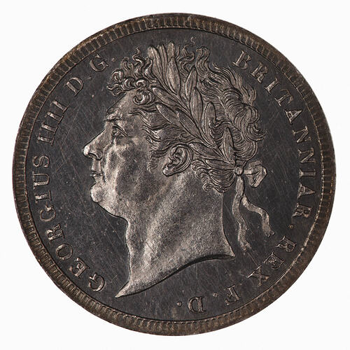 Laureate head of the King facing left; around, GEORGIUS IIII D. G. BRITANNIAR. REX F. D.