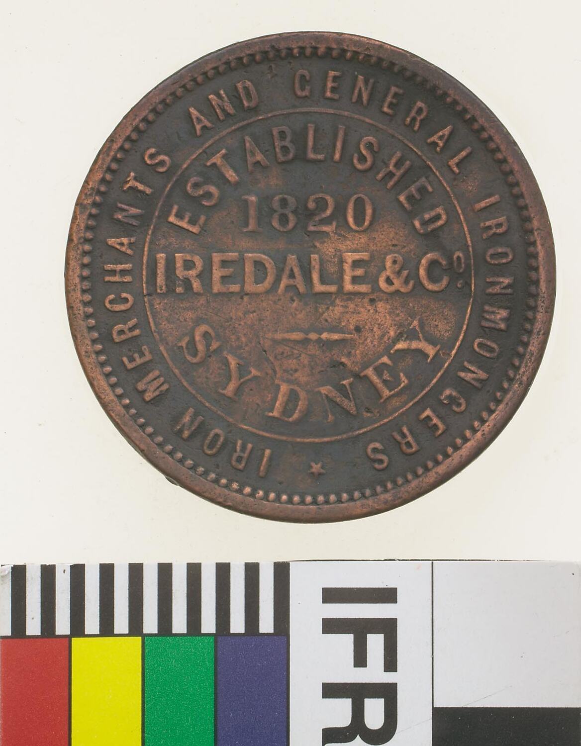 At centre within line circle, ESTABLISHED / 1820 / IREDALE & CO. / SYDNEY around, * IRON MERCHANTS AND GENERAL IRONMONGERS