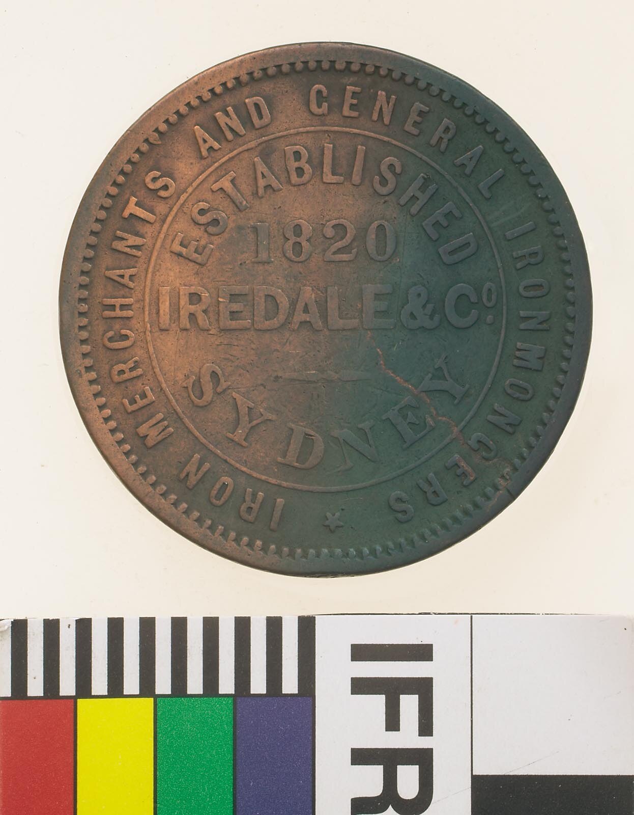 At centre within line circle, ESTABLISHED / 1820 / IREDALE & CO. / SYDNEY around, * IRON MERCHANTS AND GENERAL IRONMONGERS
