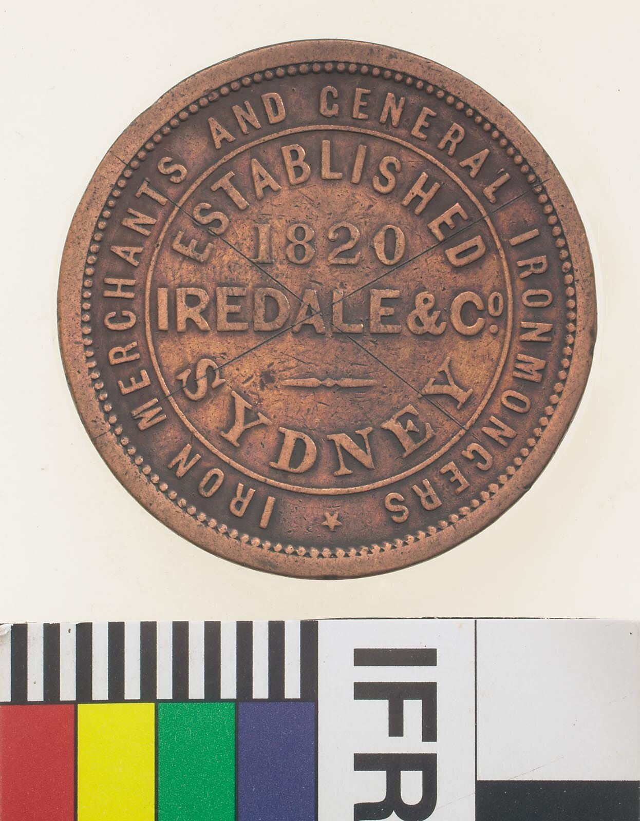 A round copper token (34 mm diameter). The token design featuring the name, partial address, business and foundation date of the issuer: Iredale and Co., Sydney, iron merchants and general ironmongers. The reverse depicts Justice standing facing left, blindfolded and extending balanced scales from her right hand, her left hand rests on an inverted cornucopiae from which fruits flow. A sailing ship is seen on the horizon to the left of the figure. This token has been cleaned and has a "X" scratched across the obverse, the reverse has re-toned green.