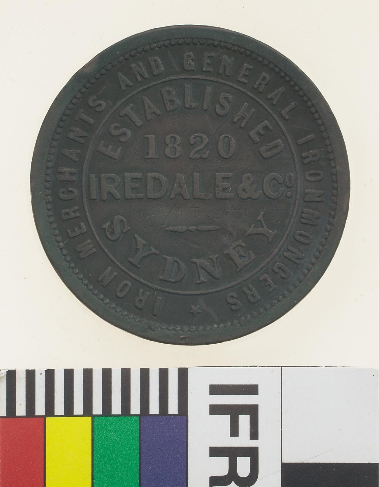 A round copper token (34 mm diameter). The token design featuring the name, partial address, business and foundation date of the issuer: Iredale and Co., Sydney, iron merchants and general ironmongers. The reverse depicts Justice standing facing left, blindfolded and extending balanced scales from her right hand, her left hand rests on an inverted cornucopiae from which fruits flow. A sailing ship is seen on the horizon to the left of the figure.