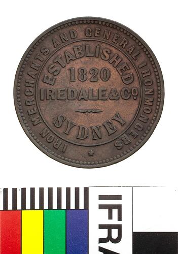 A round copper token (34 mm diameter). The token design featuring the name, partial address, business and foundation date of the issuer: Iredale and Co., Sydney, iron merchants and general ironmongers. The reverse depicts Justice standing facing left, blindfolded and extending balanced scales from her right hand, her left hand rests on an inverted cornucopiae from which fruits flow. A sailing ship is seen on the horizon to the left of the figure. This token has been cleaned.