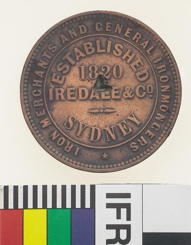 A round copper token (34 mm diameter). The token design featuring the name, partial address, business and foundation date of the issuer: Iredale and Co., Sydney, iron merchants and general ironmongers. The reverse depicts Justice standing facing left, blindfolded and extending balanced scales from her right hand, her left hand rests on an inverted cornucopiae from which fruits flow. A sailing ship is seen on the horizon to the left of the figure. This token has been cleaned and has a 'v' shaped heavy knock to the centre of the obverse.