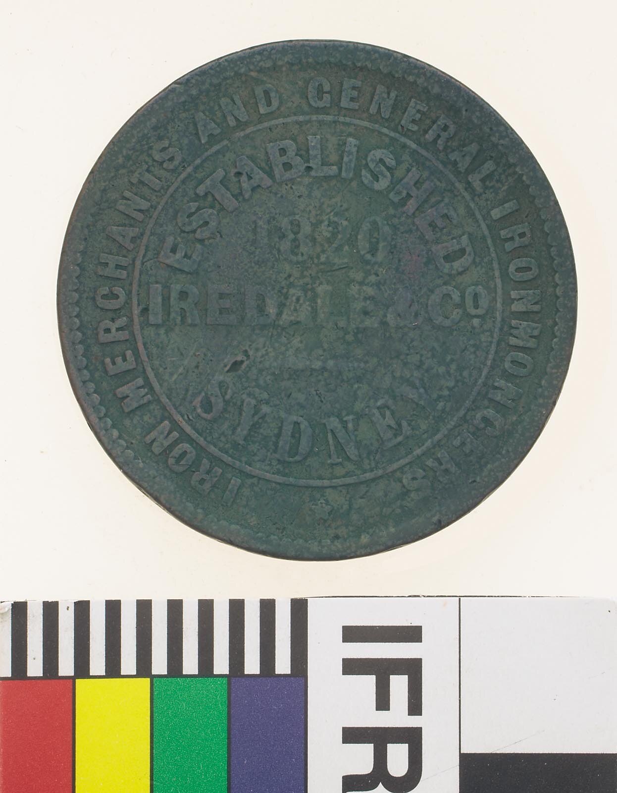 At centre within line circle, ESTABLISHED / 1820 / IREDALE & CO. / SYDNEY around, * IRON MERCHANTS AND GENERAL IRONMONGERS