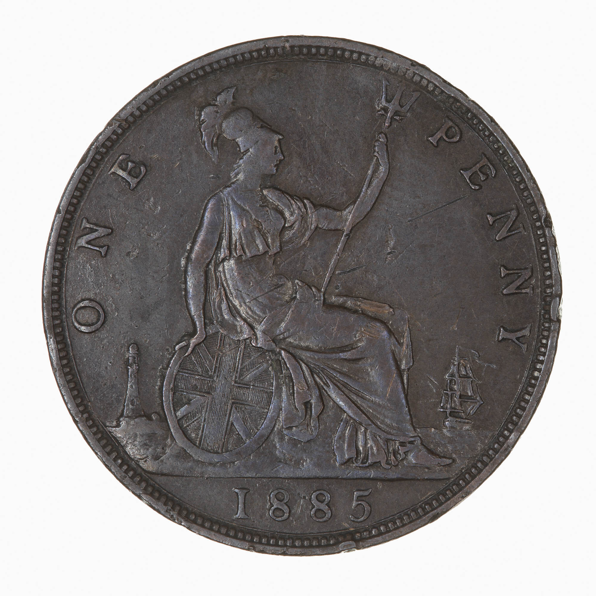 Britannia seated facing right on a rock wearing a helmet and breastplate with flowing dress; she holds a trident and rests her right hand on a shield which bears the combined crosses of the Union Flag; at right a ship sailing away; at left, a lighthouse; around, ONE PENNY; in exergue, 1885