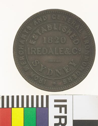 A round copper token (34 mm diameter). The token design featuring the name, partial address, business and foundation date of the issuer: Iredale and Co., Sydney, iron merchants and general ironmongers. The reverse depicts Justice standing facing left, blindfolded and extending balanced scales from her right hand, her left hand rests on an inverted cornucopiae from which fruits flow. A sailing ship is seen on the horizon to the left of the figure.