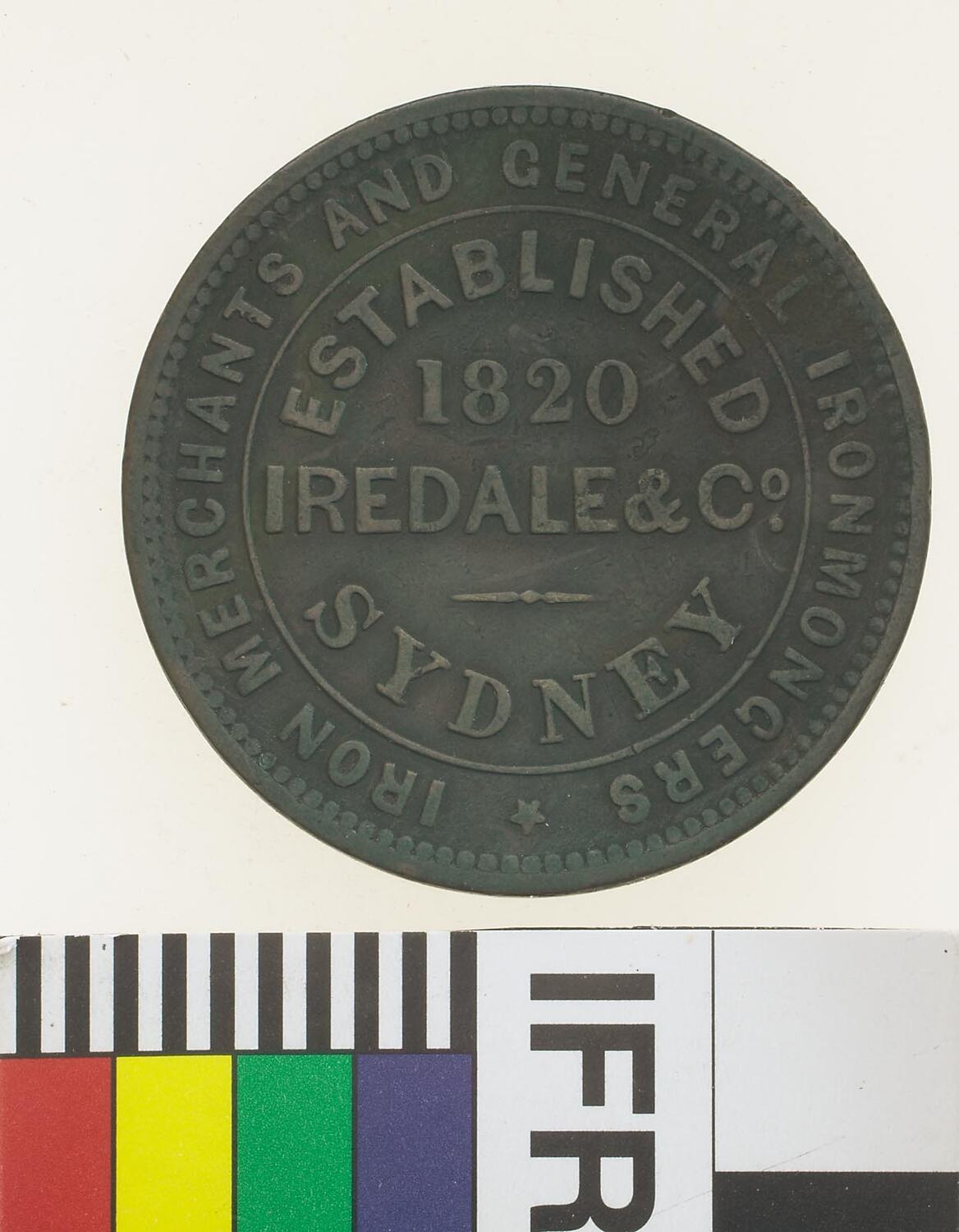 At centre within line circle, ESTABLISHED / 1820 / IREDALE & CO. / SYDNEY around, * IRON MERCHANTS AND GENERAL IRONMONGERS