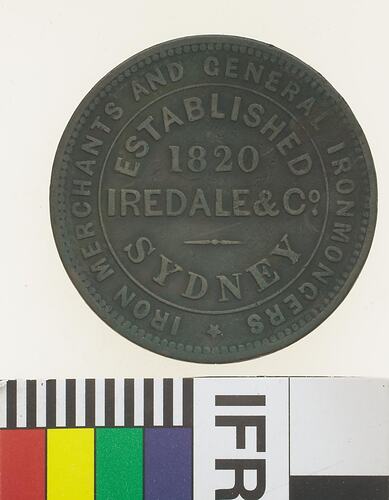 A round copper token (34 mm diameter). The token design featuring the name, partial address, business and foundation date of the issuer: Iredale and Co., Sydney, iron merchants and general ironmongers. The reverse depicts Justice standing facing left, blindfolded and extending balanced scales from her right hand, her left hand rests on an inverted cornucopiae from which fruits flow. A sailing ship is seen on the horizon to the left of the figure.