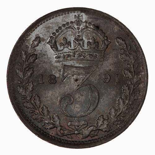 Within an open oak wreath and below a crown, the numeral 3 dividing the date 1891