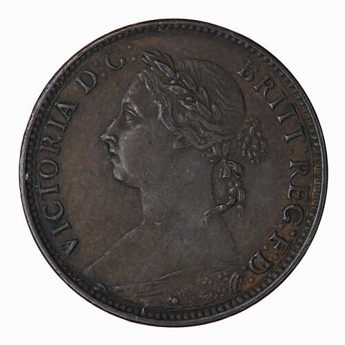 A farthing is a quarter penny. The bronze farthing replaced the earlier and larger copper farthing in 1860. This coin was current in all Australian colonies.