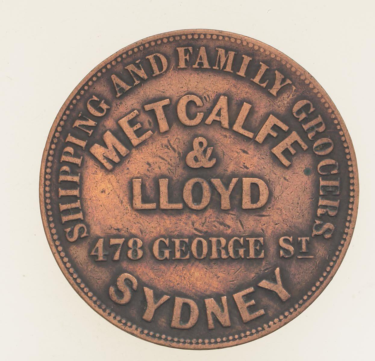 Obverse: METCALF & LLOYD 478 GEORGE STREET SYDNEY SHIPPING AND FAMILY GROCERS Reverse: WINE AND SPIRIT MERCHANTS PURVEYORS OF THE CONCENTRATED FAMILY COFFEE 1863