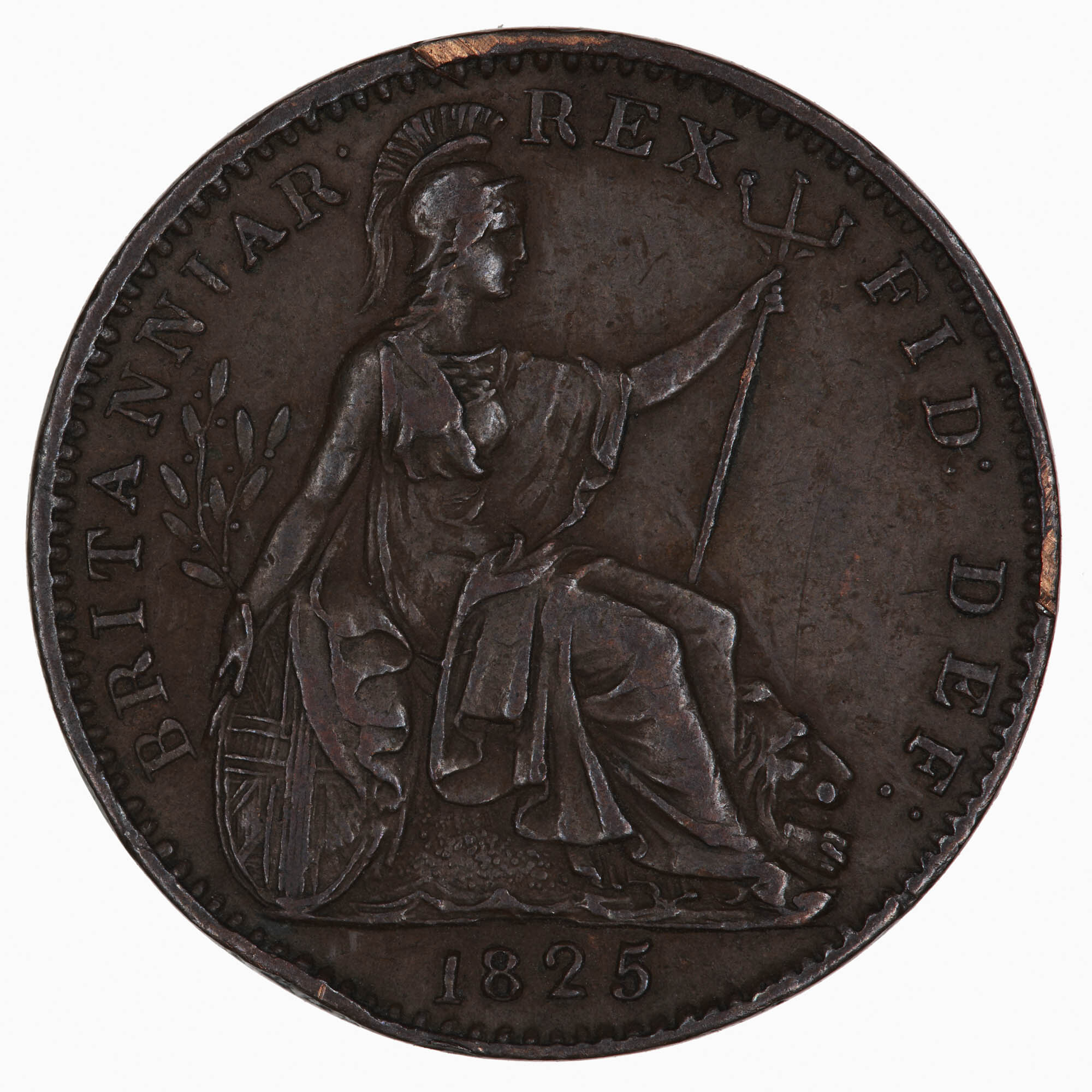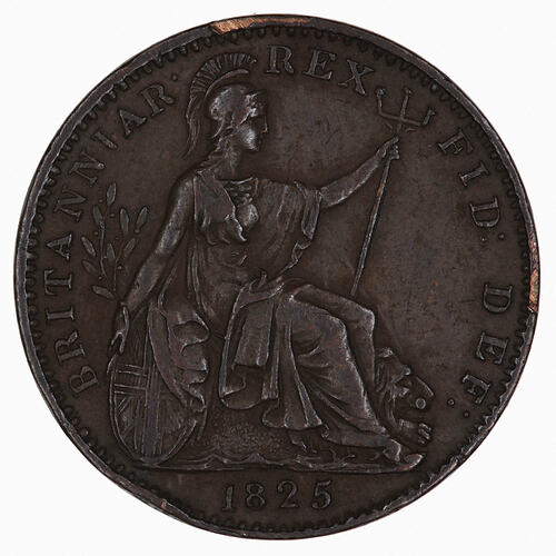 Britannia seated facing right, a lion reclining on her left side, she holds an olive branch in her right hand, which she is resting on a shield, and a trident in her left hand; around, BRITANNIAR: REX FID: DEF:; in exergue, 1825