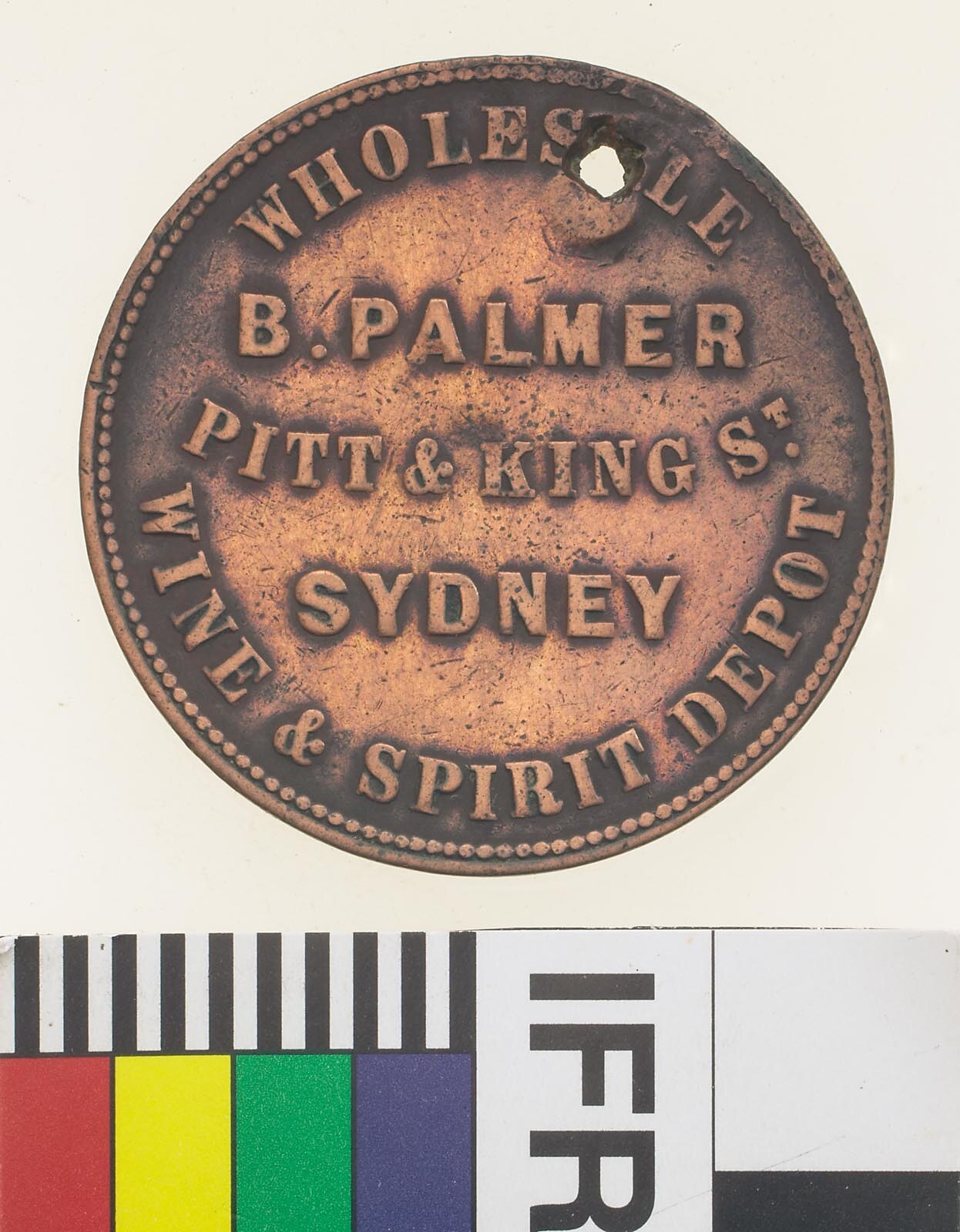 A round bronze token (34 mm diameter). The token design features the name, address and business of the issuer: B. Palmer, Liverpool Arms, Pitt & King Street, Sydney, wine and spirit depot. The reverse features a representation of the mythical Liver bird, featured on early Arms of Liverpool. The Liver holds a sprig of olive in its beak (interpreted by Chitty as a 'liver weed', the sea-weed that proliferated in the estuary near Liverpool) and stands on a length of rope. This token has been cleaned and the reverse re-toned green. The token is holed through the letters ER of LIVERPOOL.