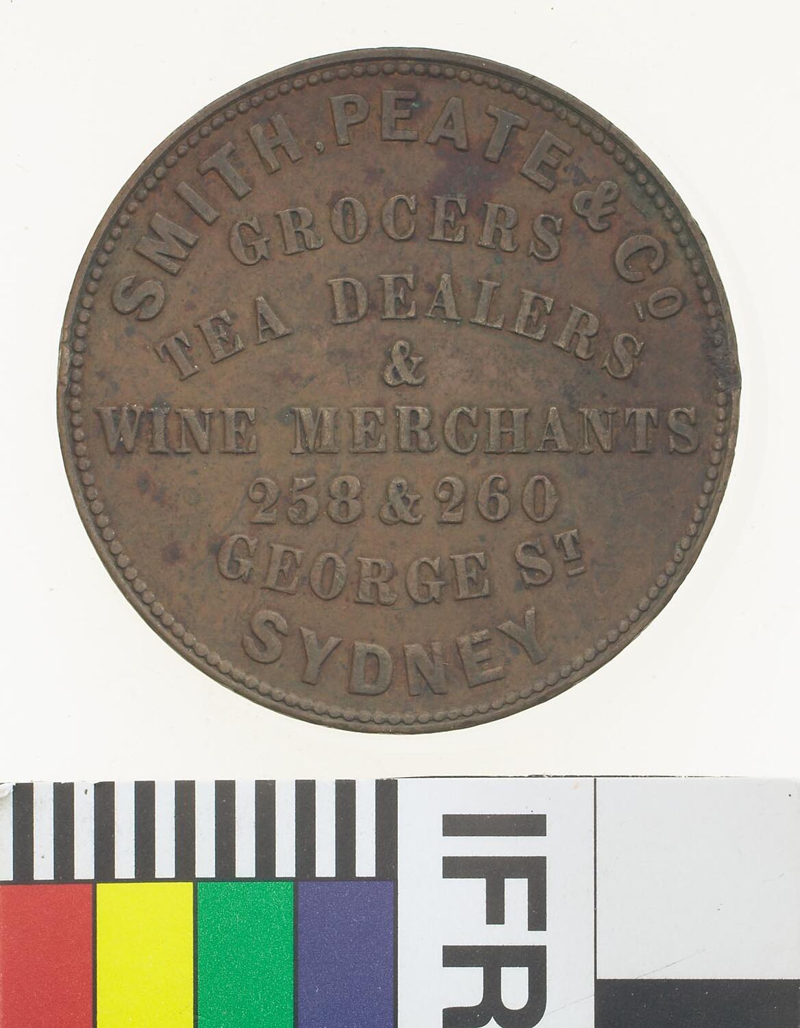 Obverse: SMITH, PEATE & Co. GROCERS TEA DEALERS & WINE MERCHANTS 258 & 260 GEORGE ST. SYDNEY Reverse: ESTABLISHED 1836