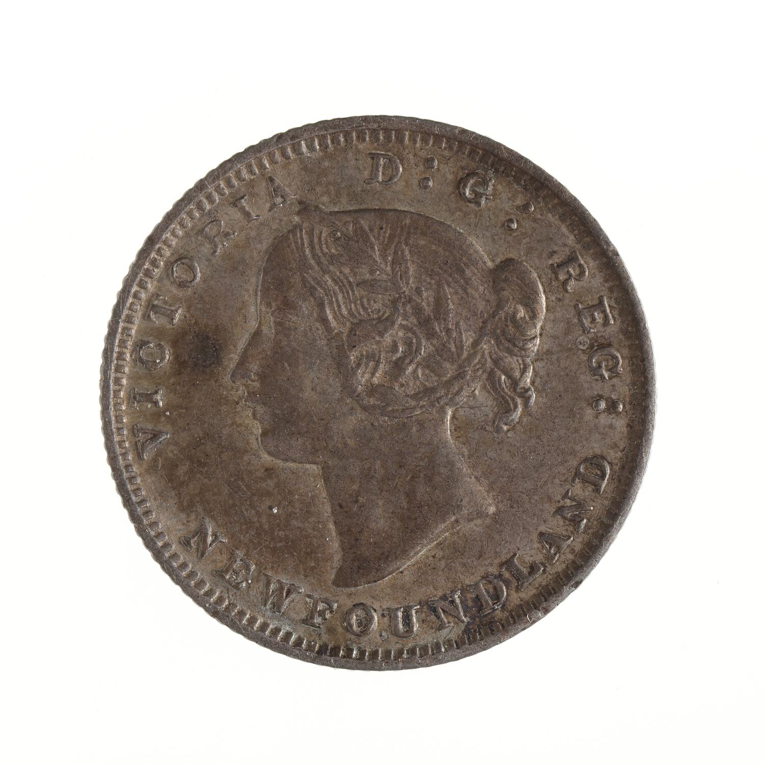 Laureate head of the Queen, with plait of hair falling below the ear, facing left; around below, NEWFOUNDLAND; around above, VICTORIA D:G: REG: